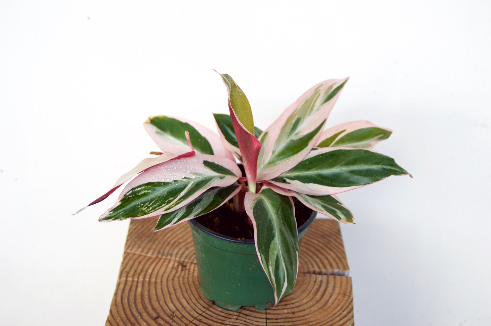 This striking variegated beauty called a Stromanthe 'Triostar' is in the marantacae family. They are phototropic, which means they move slowly throughout the day to make sure all of their leaves are photosynthesizing. Stromanthe species are easy to care for and prefer bright indirect sun. They are sensitive to the chlorine in tap water which can cause browning on the leaves, so we recommend watering with filtered or distilled water. Water when top 1-2 inches of soil are dry. 4" plants are best for a 5” ceramic pot with drainage, 6" pots are best for a 7" ceramic pot with drainage. Standard potting soil is suggested.